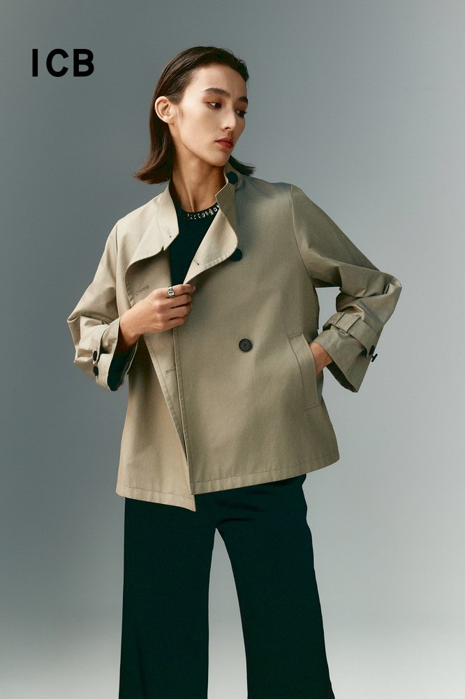 棉混纺双排扣立领短风衣休闲外套商场同款 ICB日系秋季 通勤宽松版