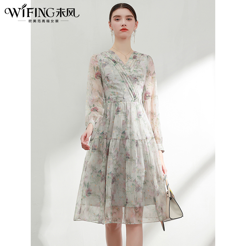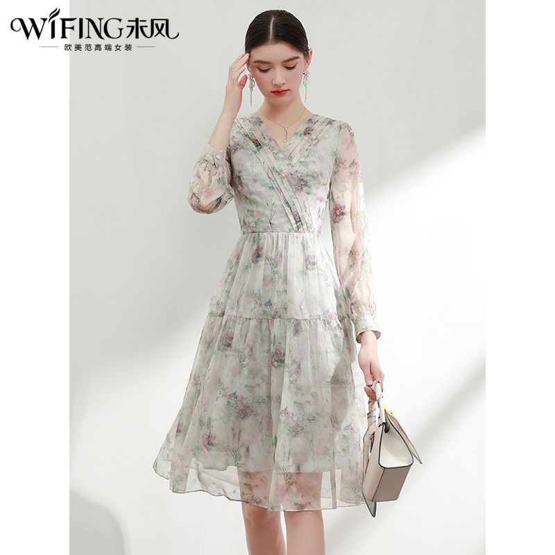 高腰显瘦长袖 女装 裙子 新款 未风V领雪纺碎花连衣裙女秋2025年秋季