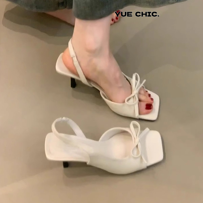 中跟 一字带蝴蝶结露趾方头高跟鞋 气质细跟凉鞋 女夏外穿2025新款