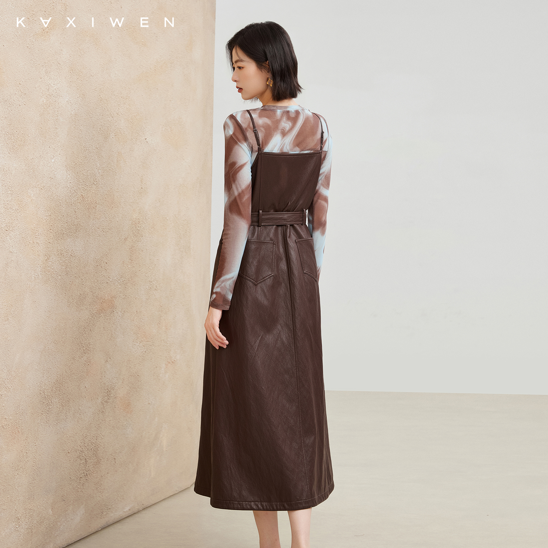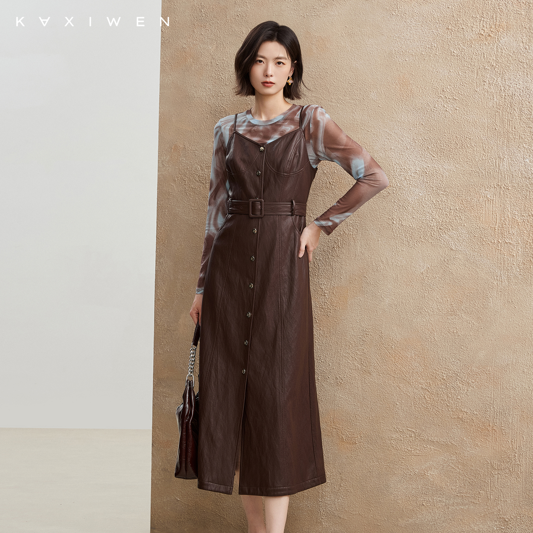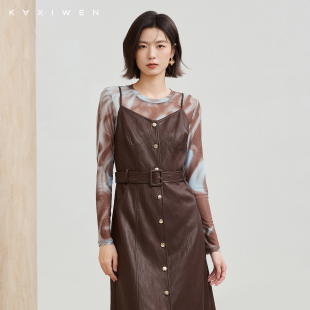 美式 新款 复古V领收腰A字连衣裙 皮质吊带裙2025秋季 佧茜文时尚