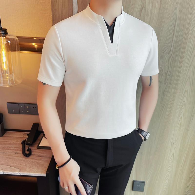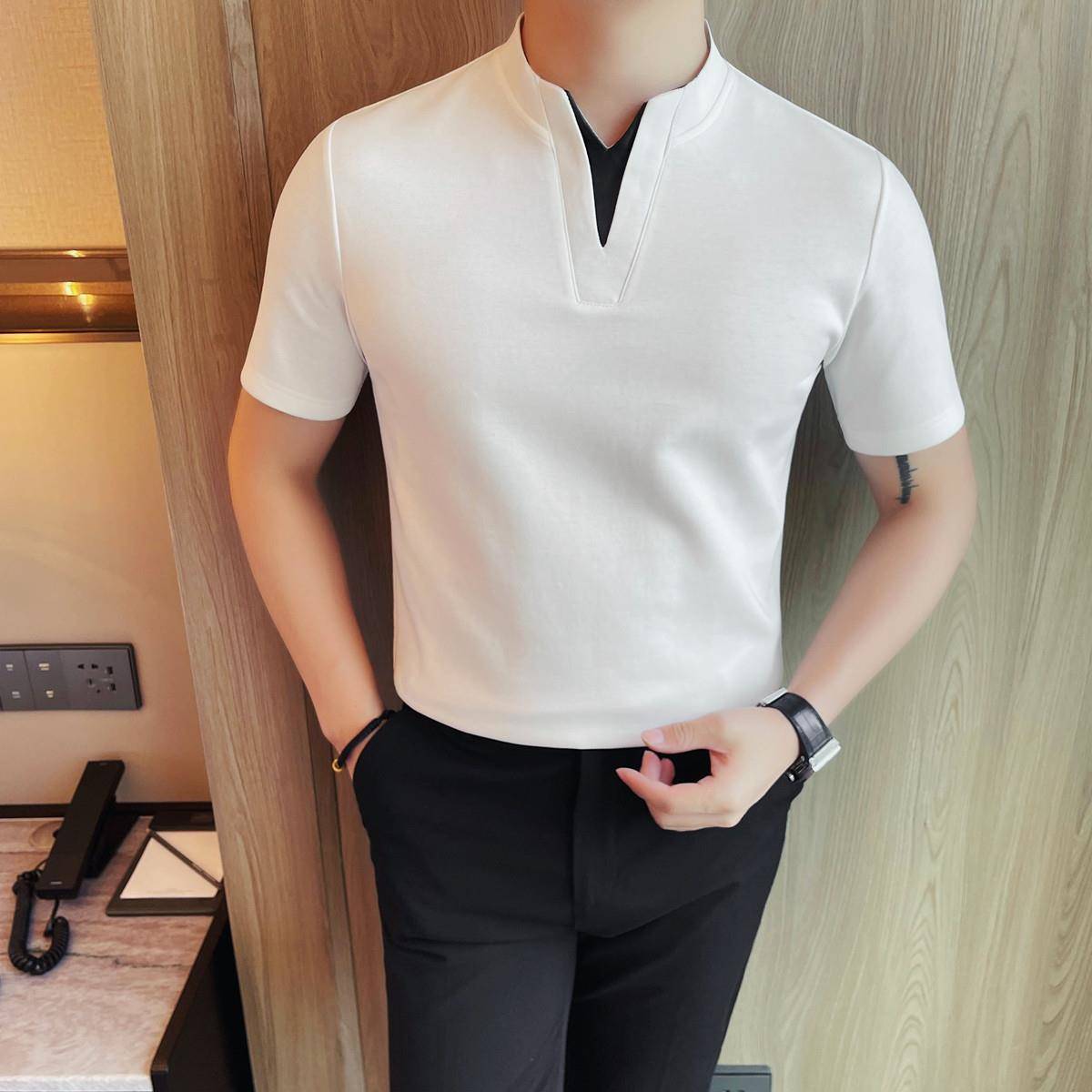 百搭痞帅修身 亨利领短袖 潮流时尚 薄款 V领体0703r t恤男假俩件夏季