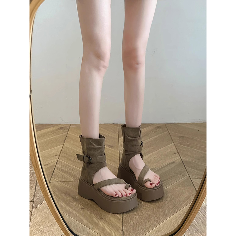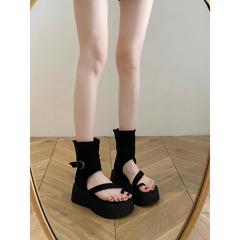 高帮凉鞋 时尚 增高短靴夹趾中跟松糕底 新款 厚底罗马凉靴女2025夏季