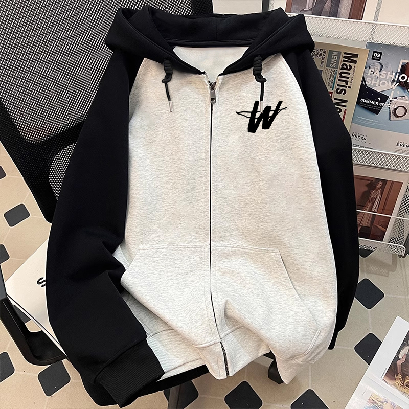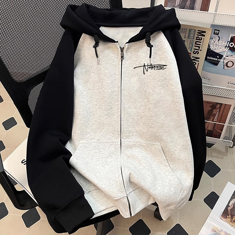 插肩撞色连帽卫衣男士 拉链外套 春秋ins潮牌oversize宽松情侣开衫