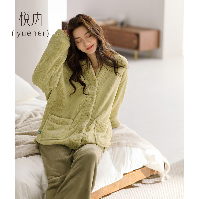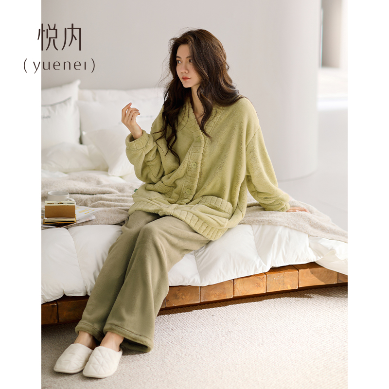 加厚款 大码 珊瑚绒睡衣女套装 开衫 家居服加绒可爱法兰绒长袖 秋冬季