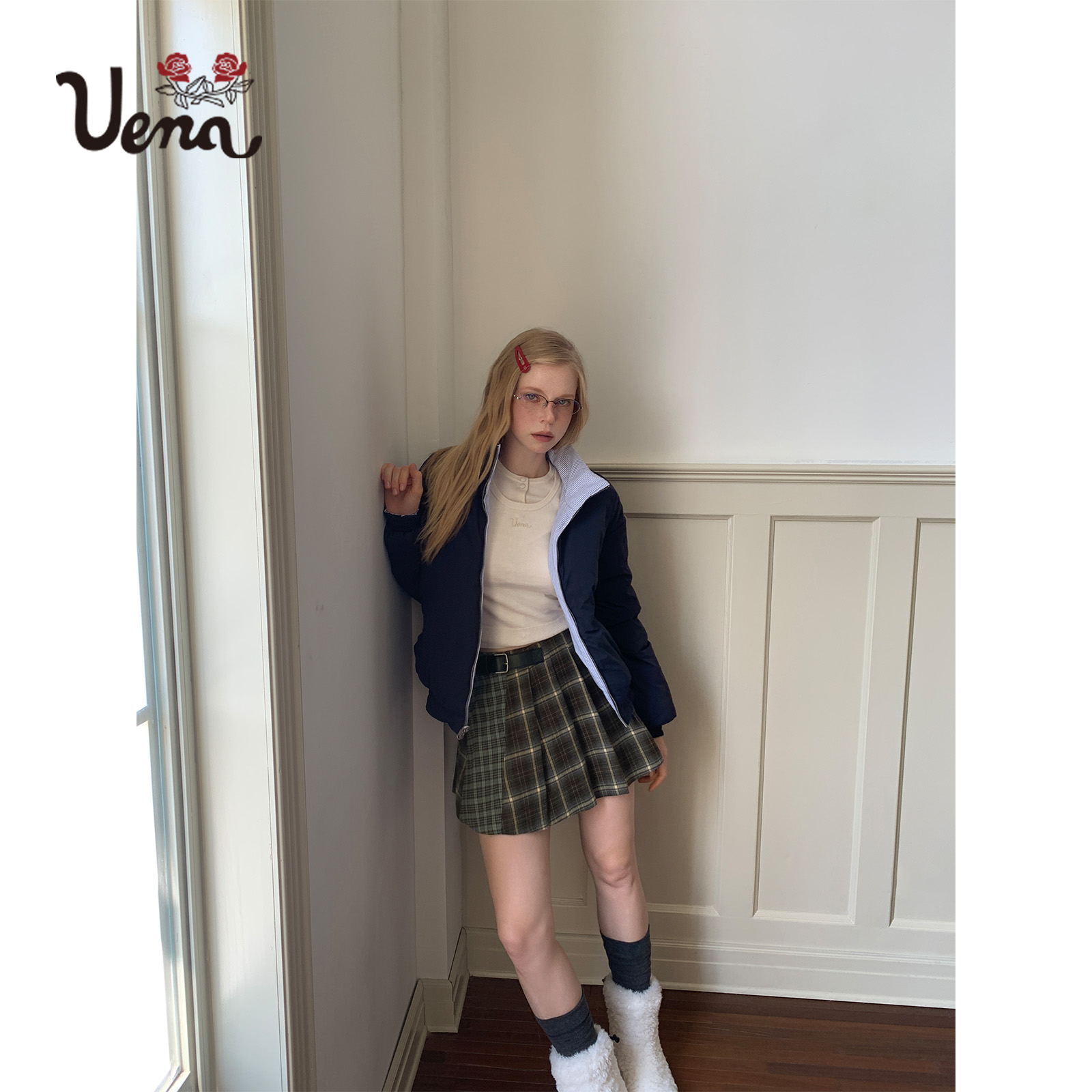 复古撞色格纹拼接腰头皮袢A字百褶半身裙女 Uena美式 笔尖绮梦