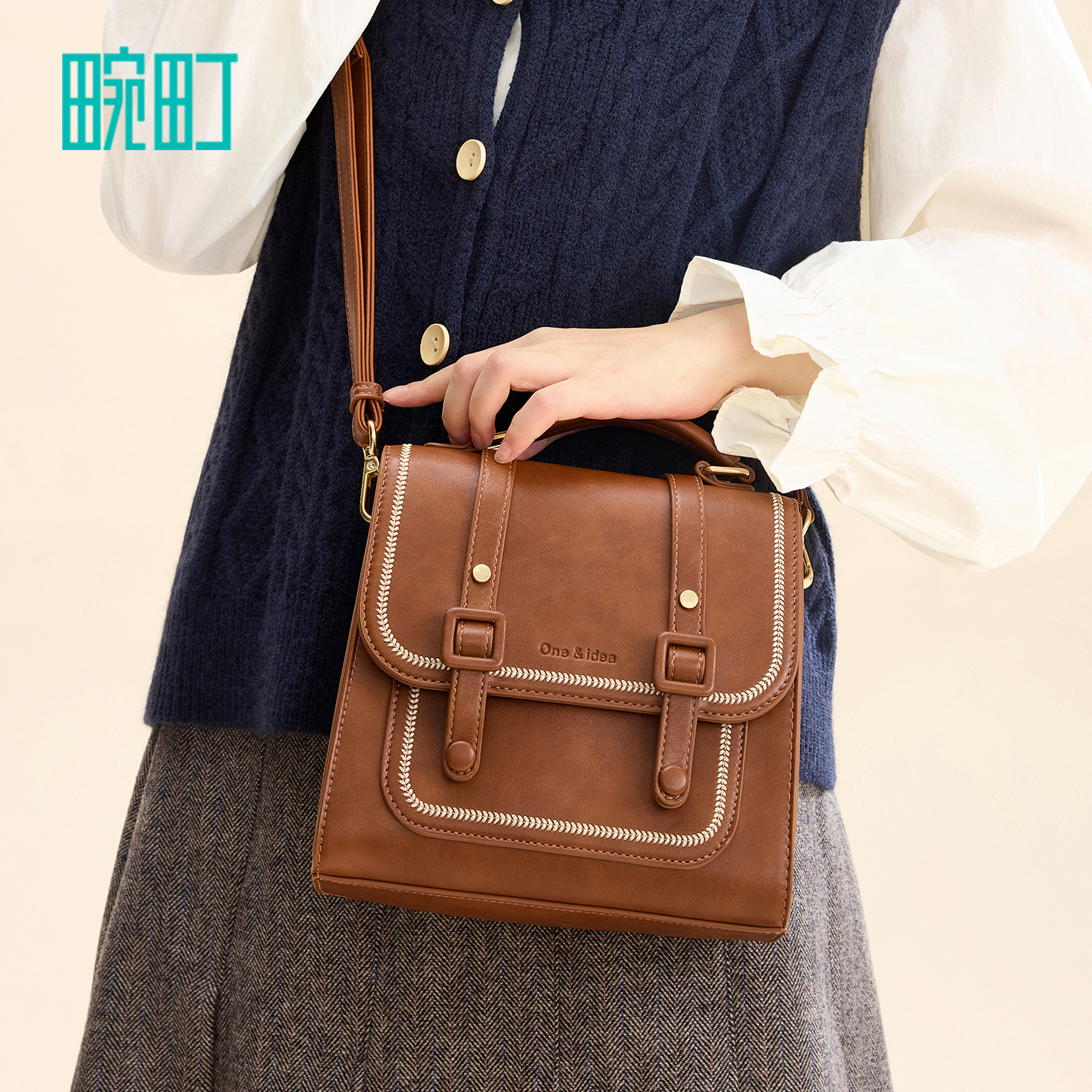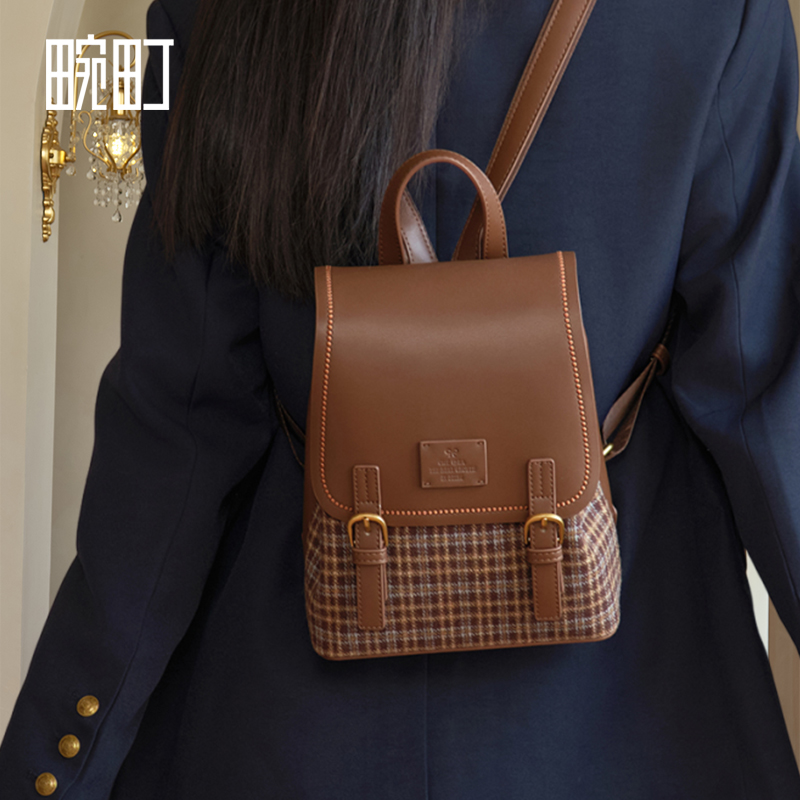 畹町复古学院剑桥包秋冬季 女包红格纹双搭扣双肩背包英伦风通勤包
