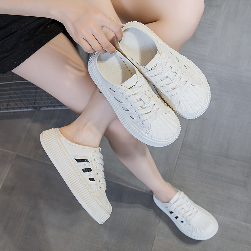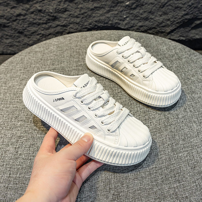 厚底增高板鞋 贝壳头半拖小白鞋 网面透气真皮休闲鞋 薄款 女2025夏季