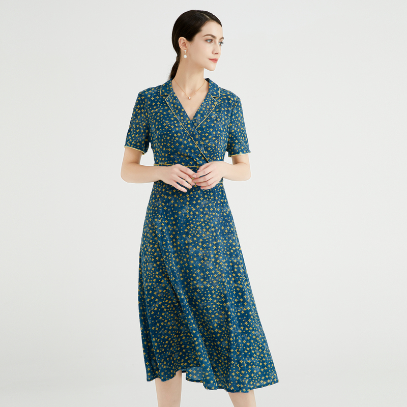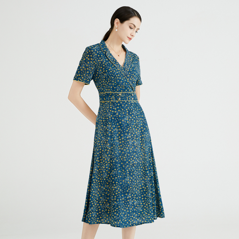 长裙A字裙时尚 领连衣裙子收腰短袖 女蓝色印花西装 马天奴春秋新款