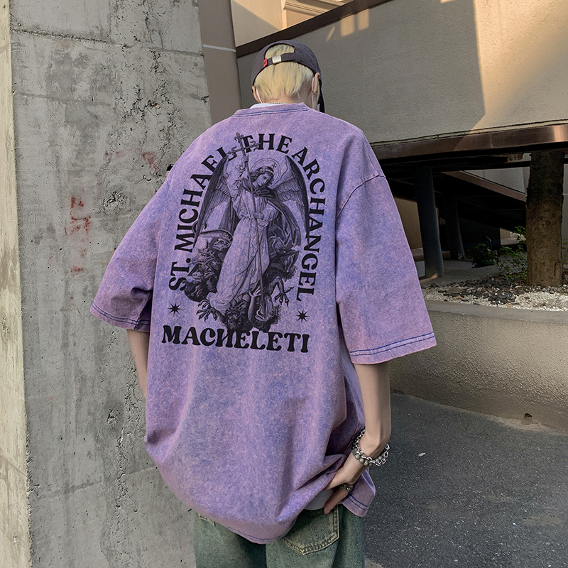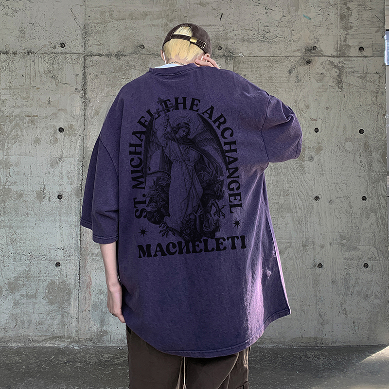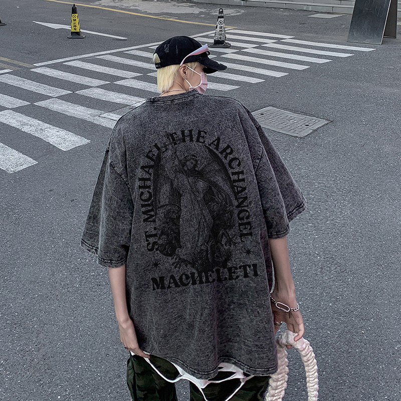 复古水洗情侣T恤设计感五分袖 美式 上衣服 男夏季 欧美高街vibe短袖