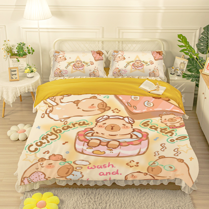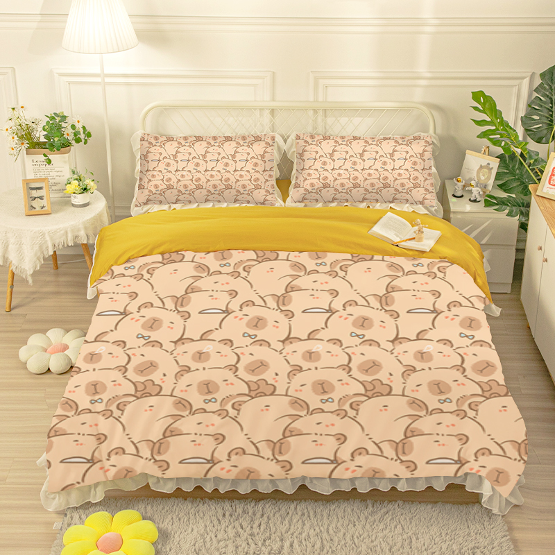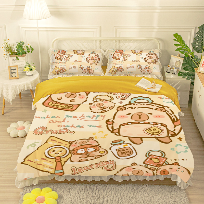 全棉花边卡皮巴拉四件套豚豚被套1.8m床上用品三件套家用双人床