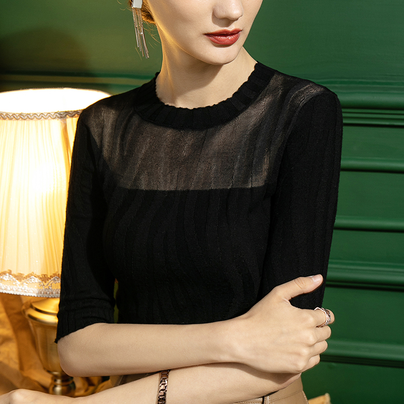 新款 内搭中袖 纯羊毛针织衫 网纱性感修身 黑色 女打底五分袖 2025秋季