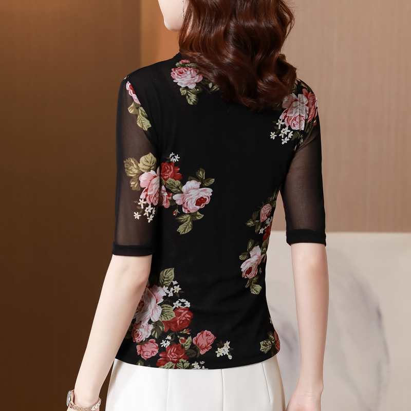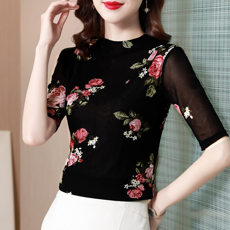 蕾丝上衣内搭T恤显瘦洋气小衫 半高领网纱打底衫 修身 半袖 秋 女夏季