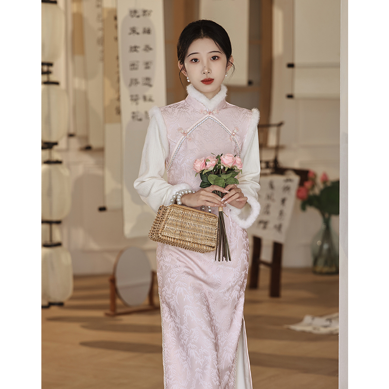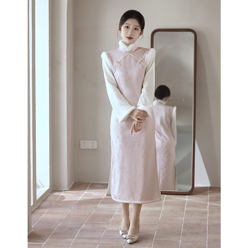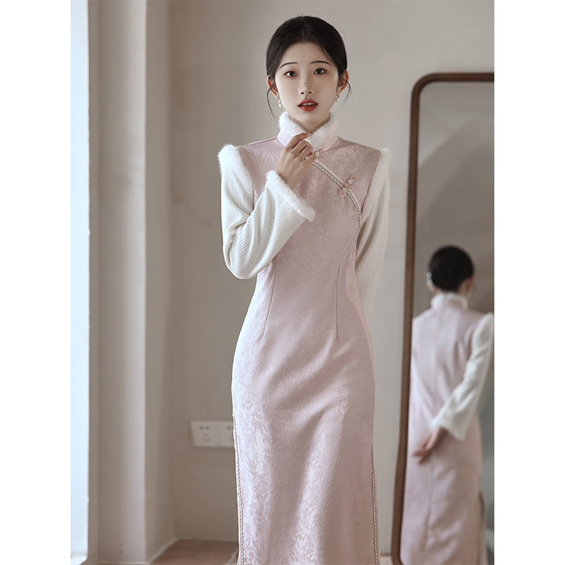 改良旗袍长款 新中式 国风V领长袖 新款 裙子 粉色连衣裙女2025年秋季