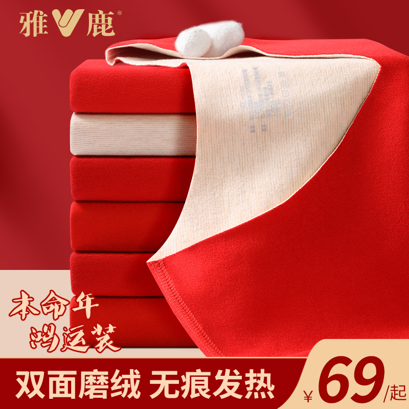 袜子结婚 女士红色保暖内衣男内裤 雅鹿100%纯棉本命年秋衣秋裤 套装