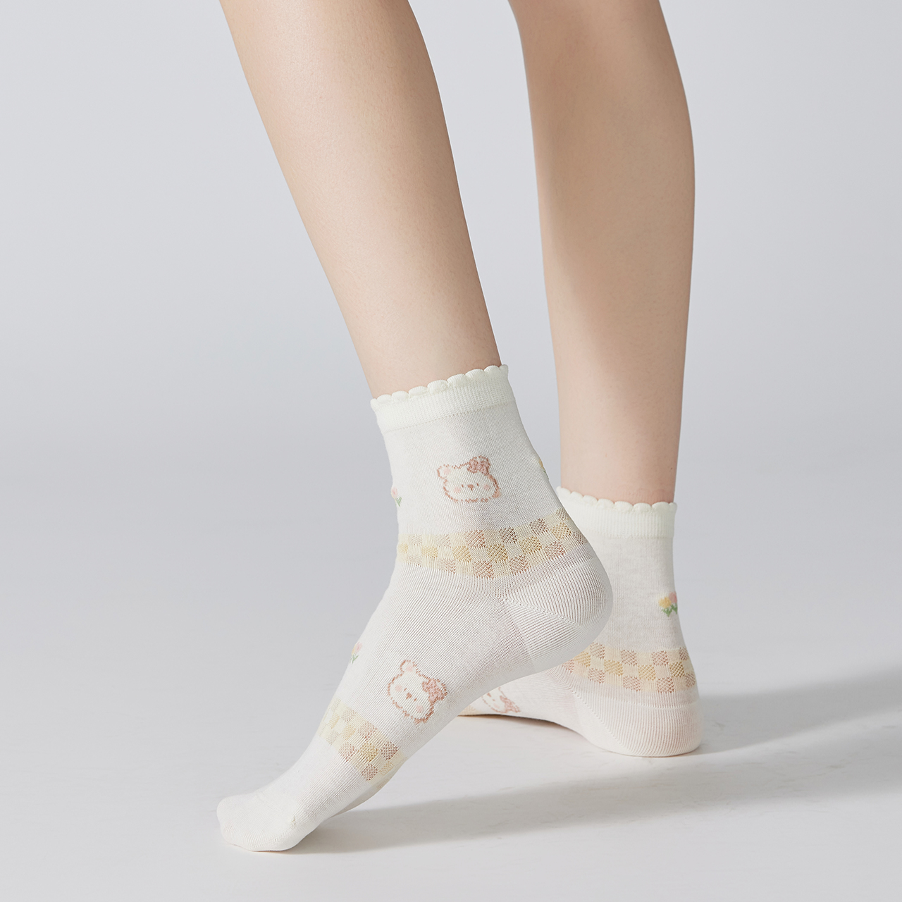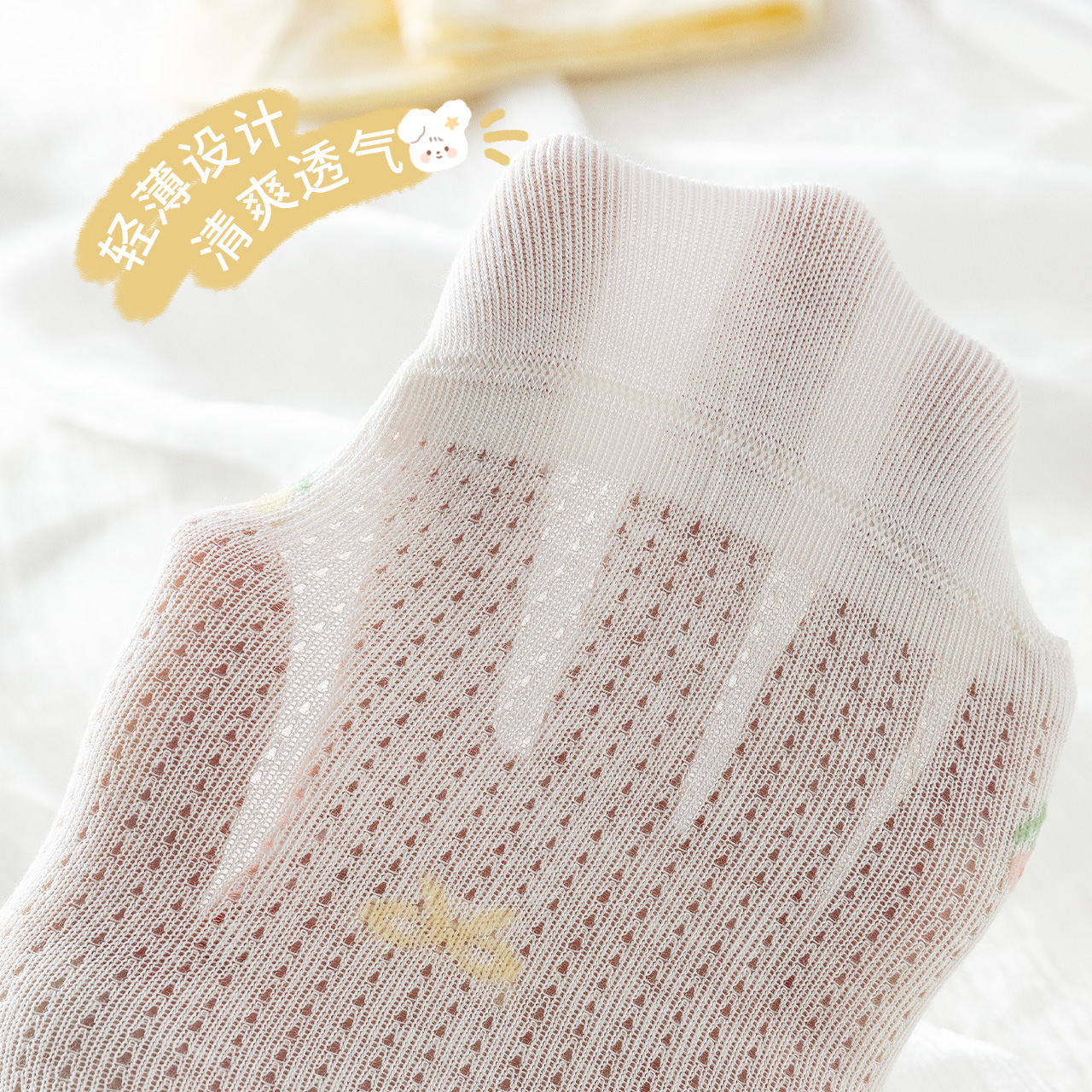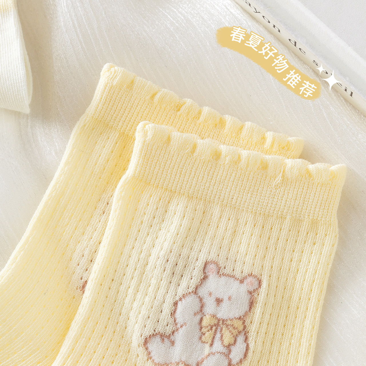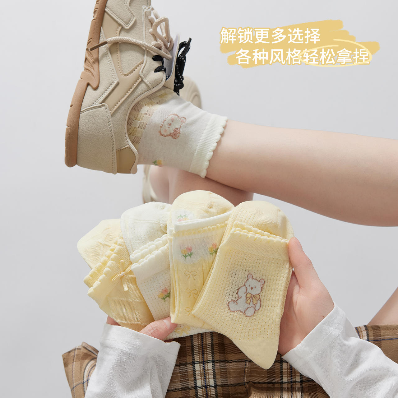 袜子女可爱女生花边短袜2025新款 春夏网眼棉舒适奶黄中筒女袜抗菌