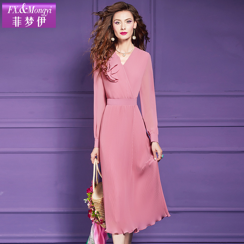 赫本风法式 太平鸟长袖 修身 中长款 船领收腰褶皱连衣裙女25春新款