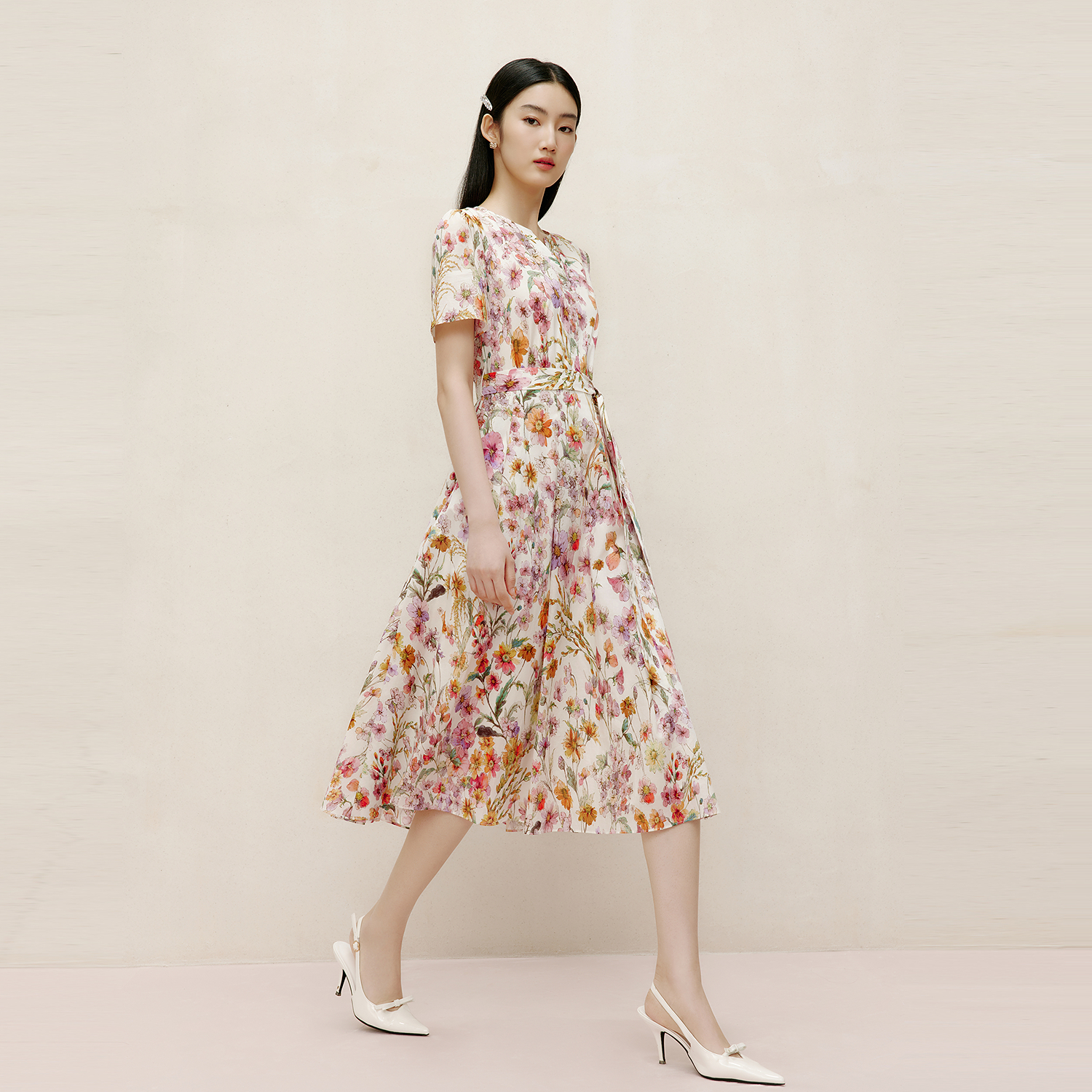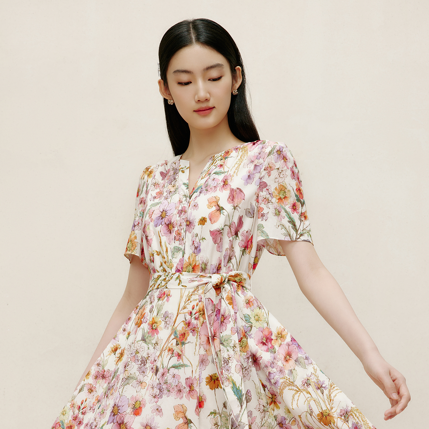 朗姿集团LIME莱茵棉质V领收腰印花连衣裙25夏度假风褶皱裙摆长裙