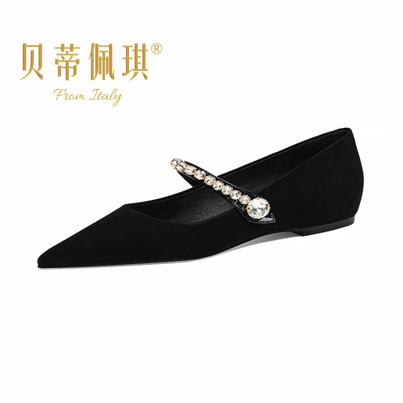 水钻一字带真皮内增高鞋 新款 子 女2025年春季 百搭尖头浅口中跟单鞋