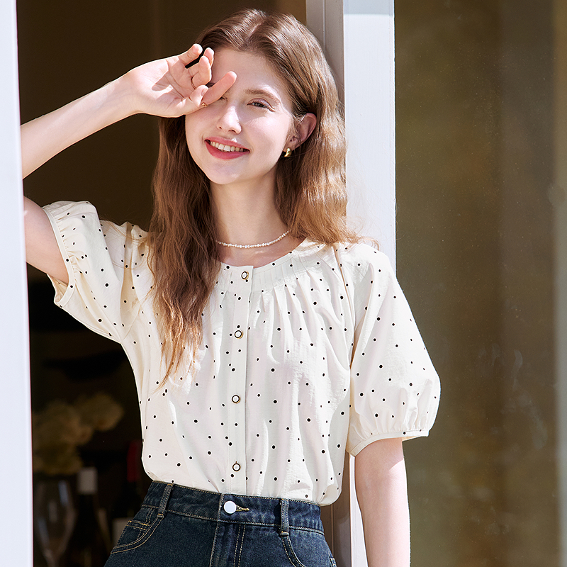 新款 betu百图灯笼袖 2025年夏季 女短袖 宽松圆领气质衬衣 波点衬衫
