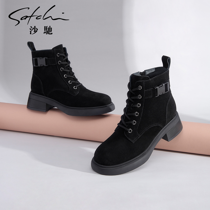 张凌赫周雨彤同款 百丽小野马英伦风靴子女冬加绒棕色马丁靴短靴预