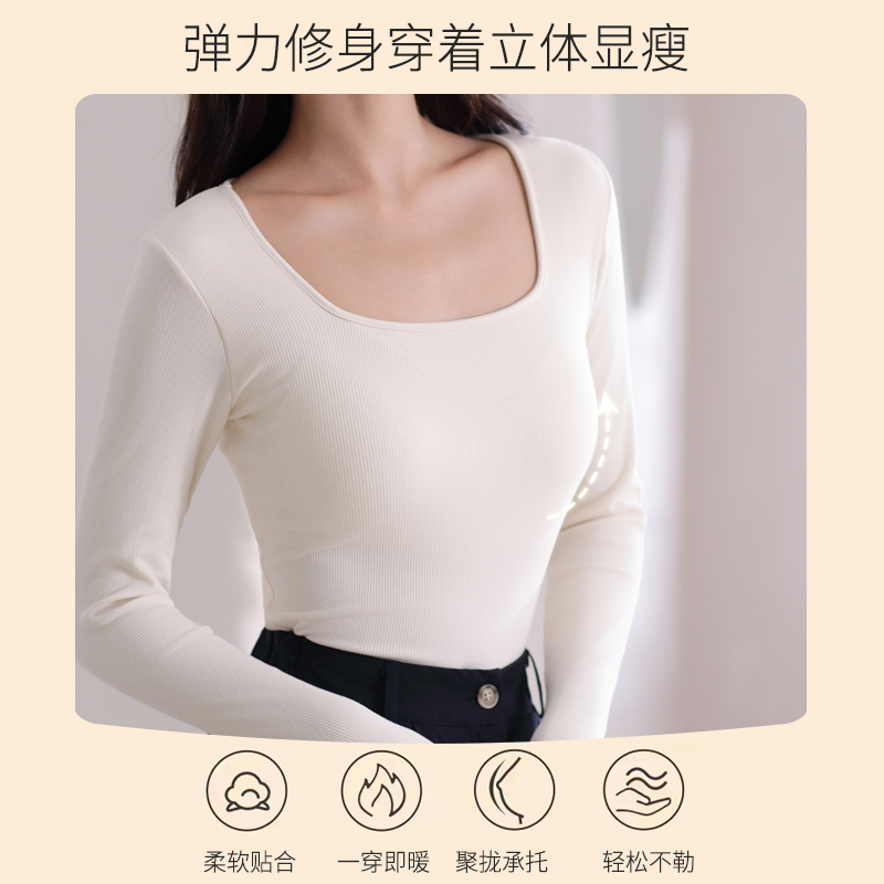 带胸垫保暖内衣女薄绒德文胸一体发热磨毛秋衣修身 单件上衣 打底衫