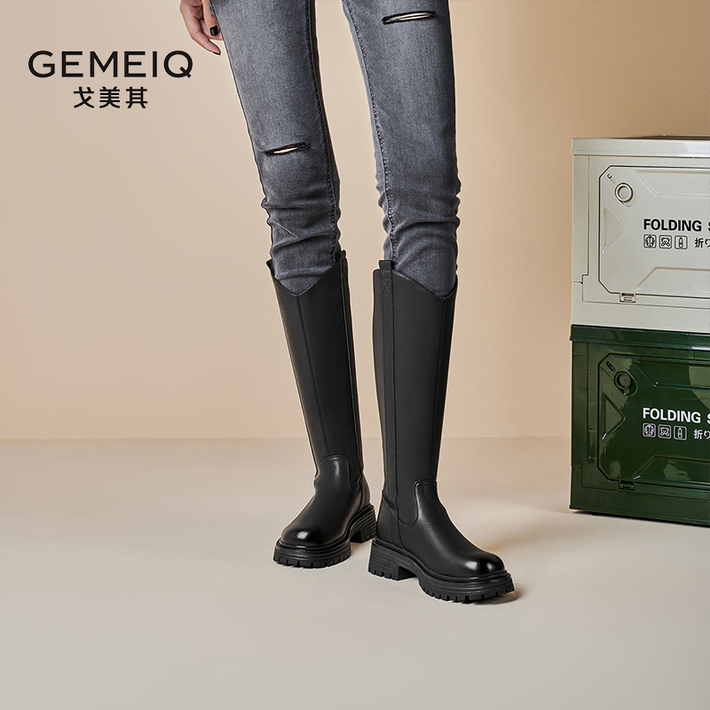 戈美其靴子女2024冬季 长筒靴小个子不过膝长靴加绒高筒骑士靴 新款
