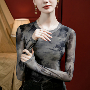 女修身 T恤上衣小衫 2025秋季 洋气女装 新款 扎染印花复古网纱打底衫