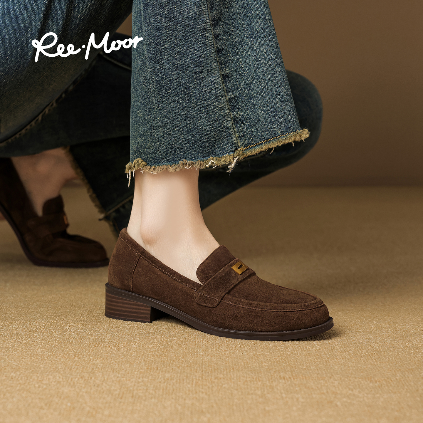 厚底增高小皮鞋 REEMOOR睿慕25秋季 复古绒面圆头乐福鞋 法式 女 新款