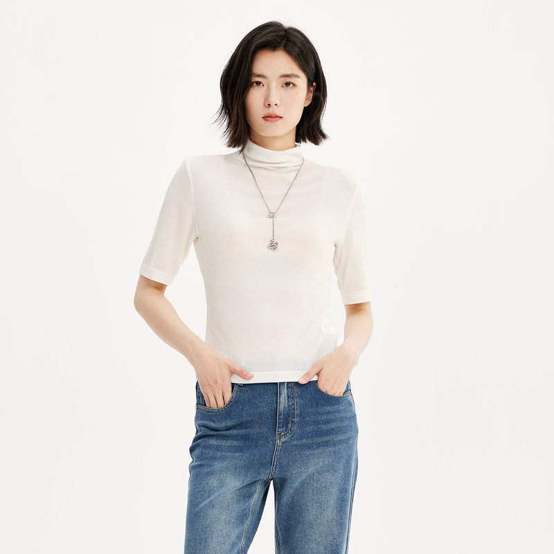 飘蕾简约纯色半高领T恤女2025秋新款 打底上衣 优雅通勤显瘦五分袖
