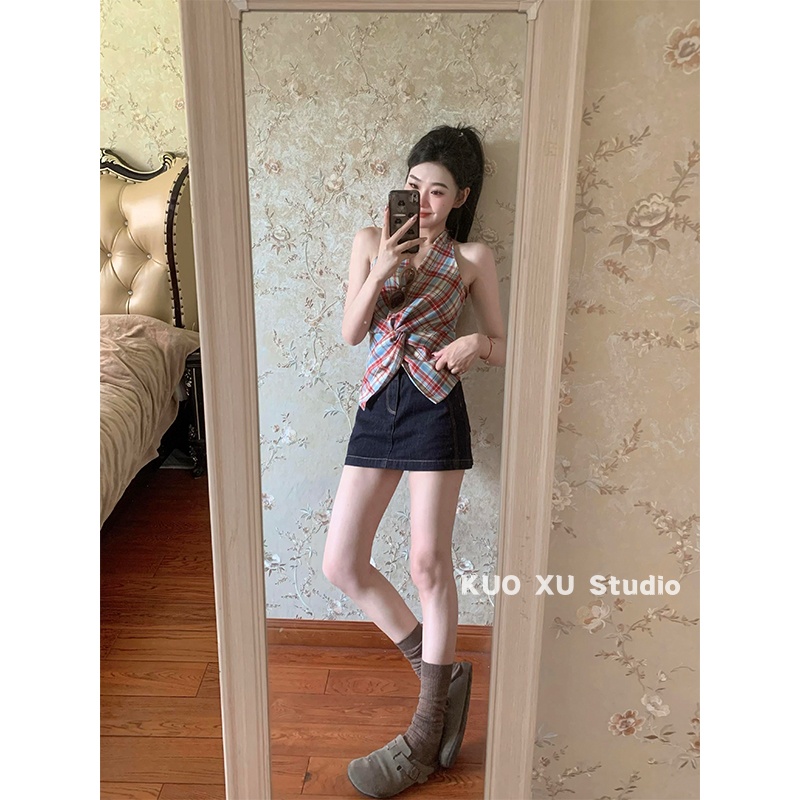 红色格子挂脖吊带背心扭结无袖 上衣牛仔半身裙包臀裙A字一步短裙