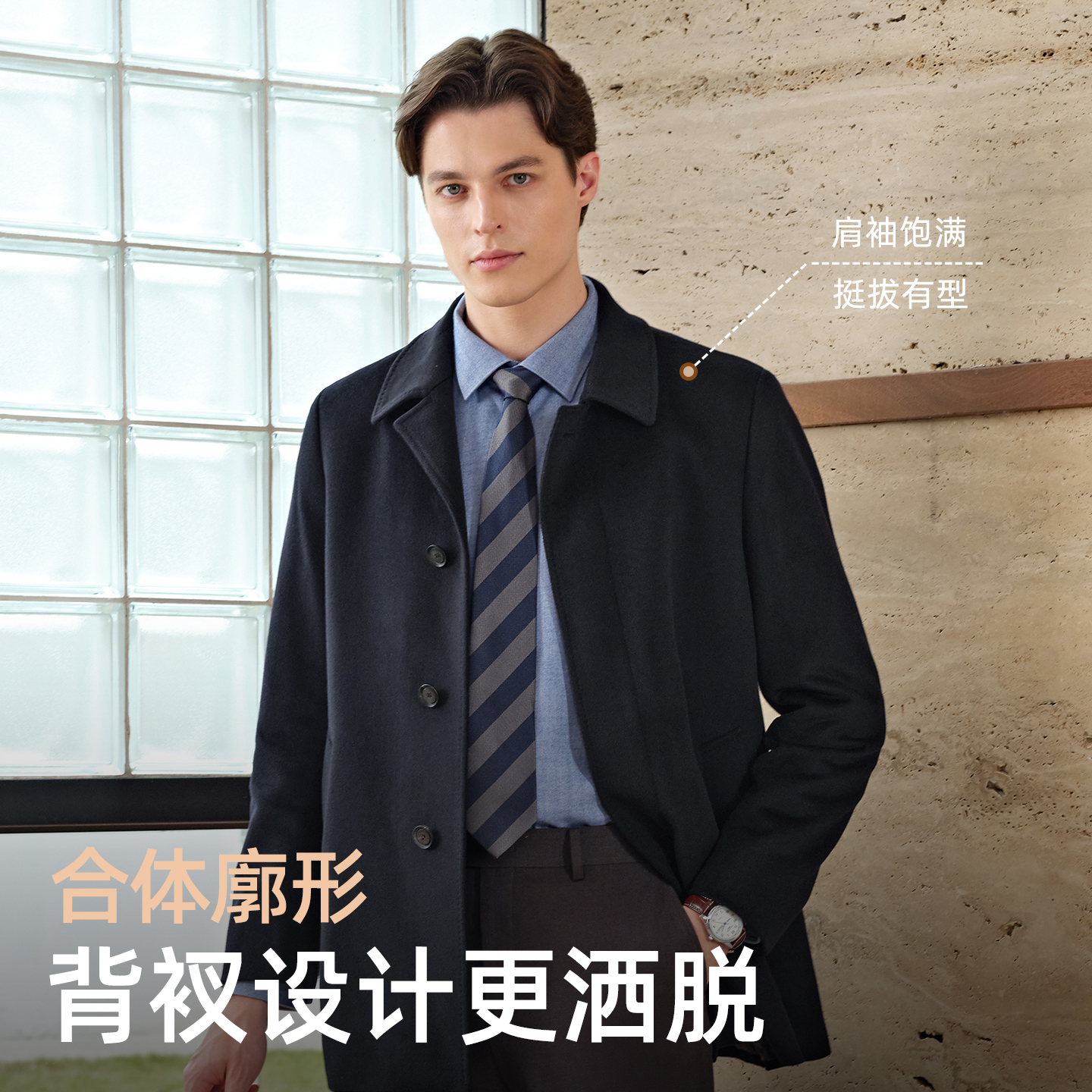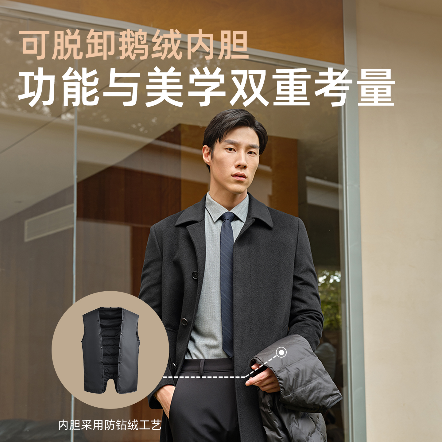 男士 雅戈尔冬季 可拆卸鹅绒内胆 商务保暖翻领羊毛大衣 牦牛绒