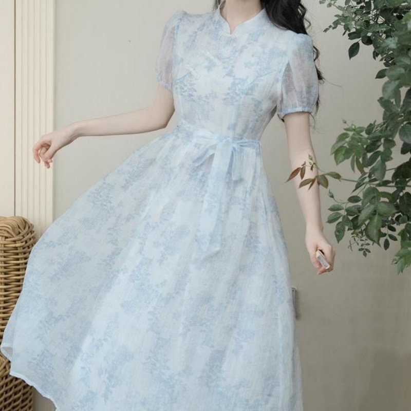 2025夏新中式 气质少女民国风绝美小清新连衣长裙子 改良旗袍年轻款