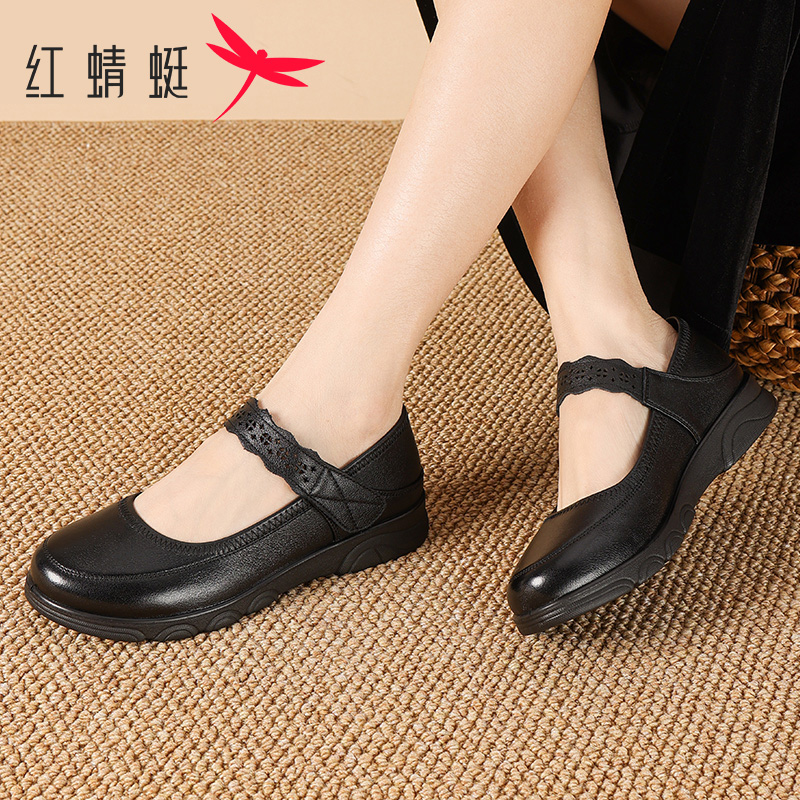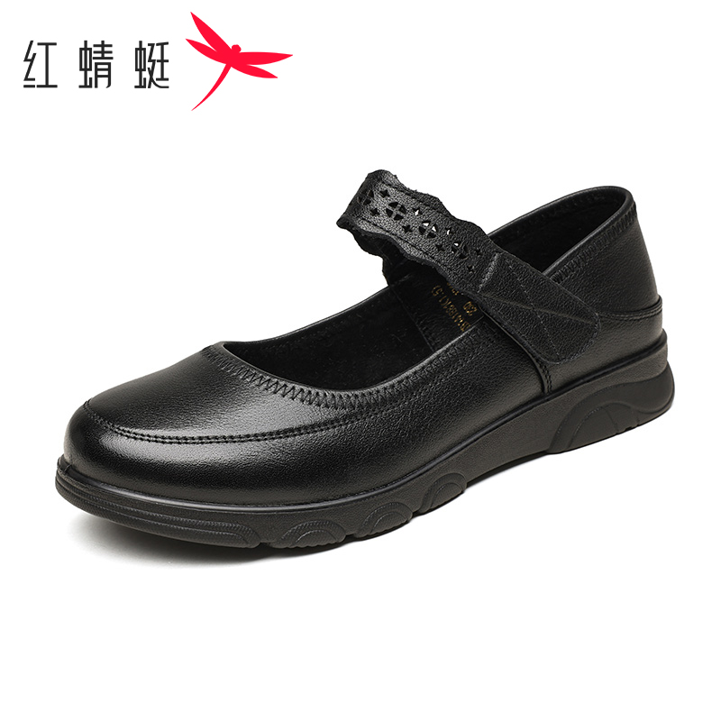 中老年妈妈鞋 红蜻蜓女鞋 舒适软底魔术贴单鞋 真皮浅口玛丽珍鞋 秋季