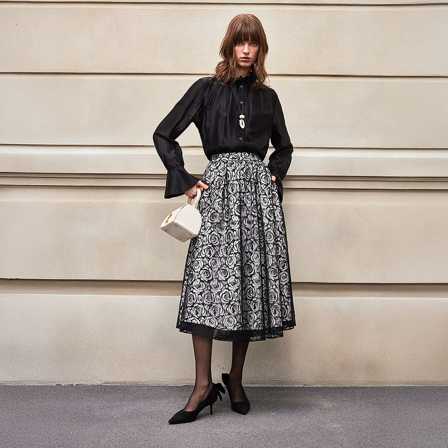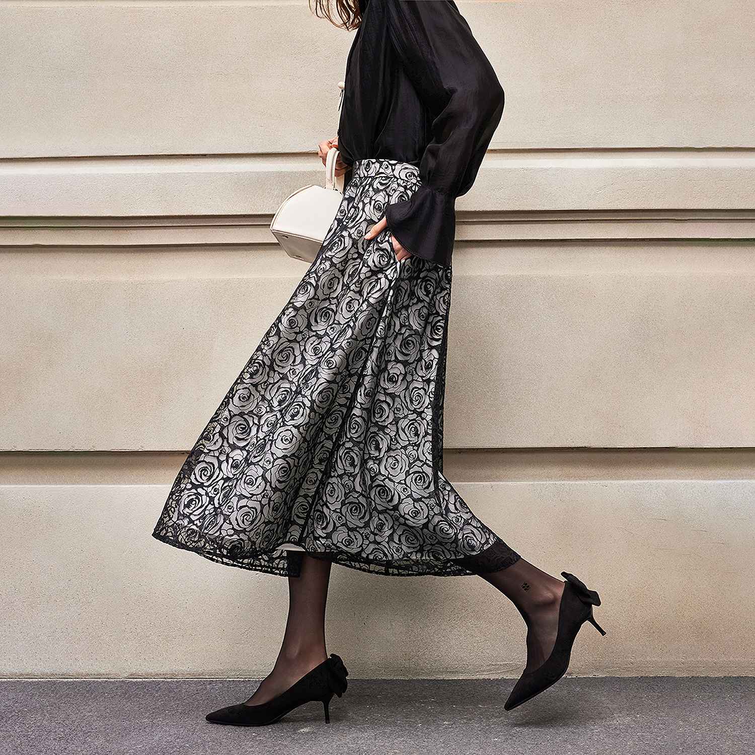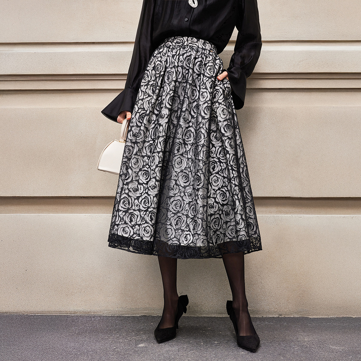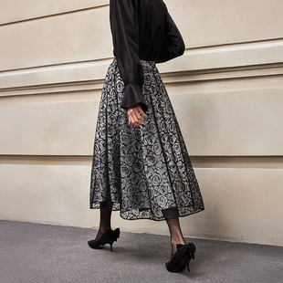 半身裙女 精致气质优雅蕾丝玫瑰黑白撞色中长款 BCBG25早秋新款 时尚