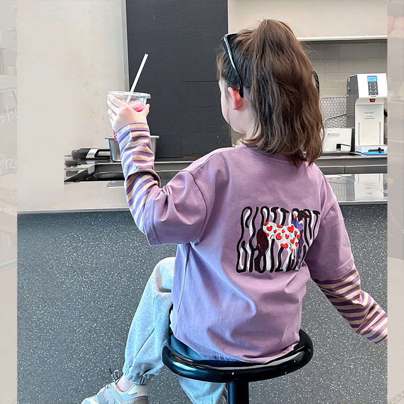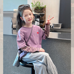 新款 大童装 洋气上衣女童2025春秋装 打底衫 条纹假两件t恤儿童长袖