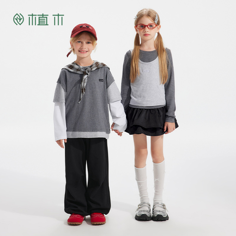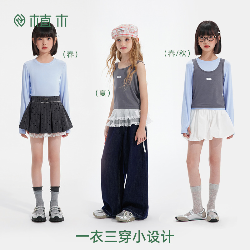 上衣儿童T恤 秋冬中大童两件套背心长袖 植木童装 女童T恤2025新款