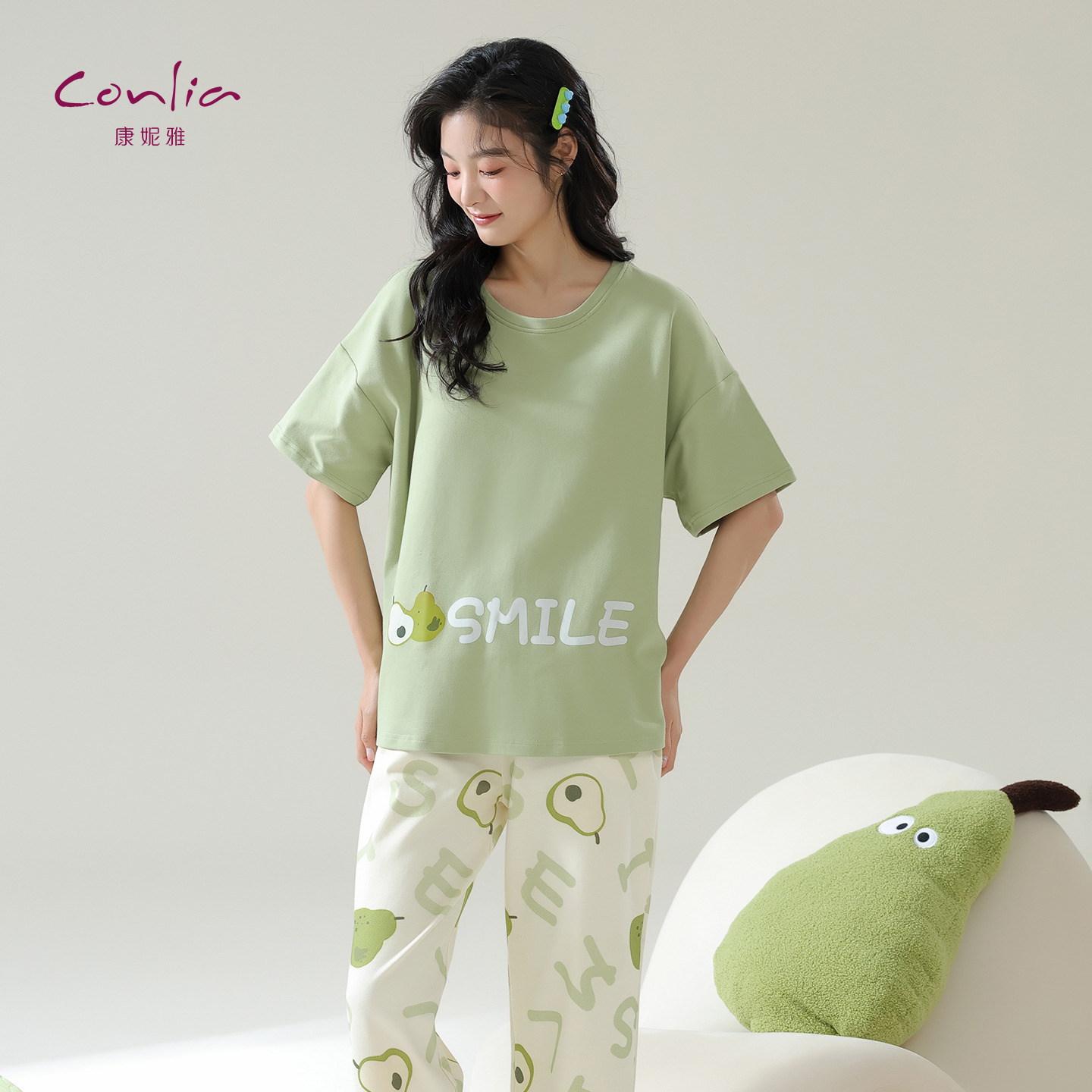 纯棉2025新款 薄款 短袖 带胸垫一体家居服套装 长裤 康妮雅睡衣女夏季