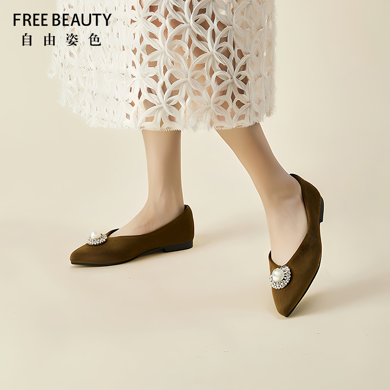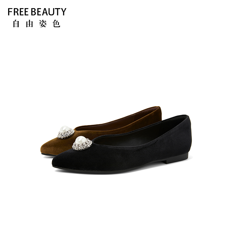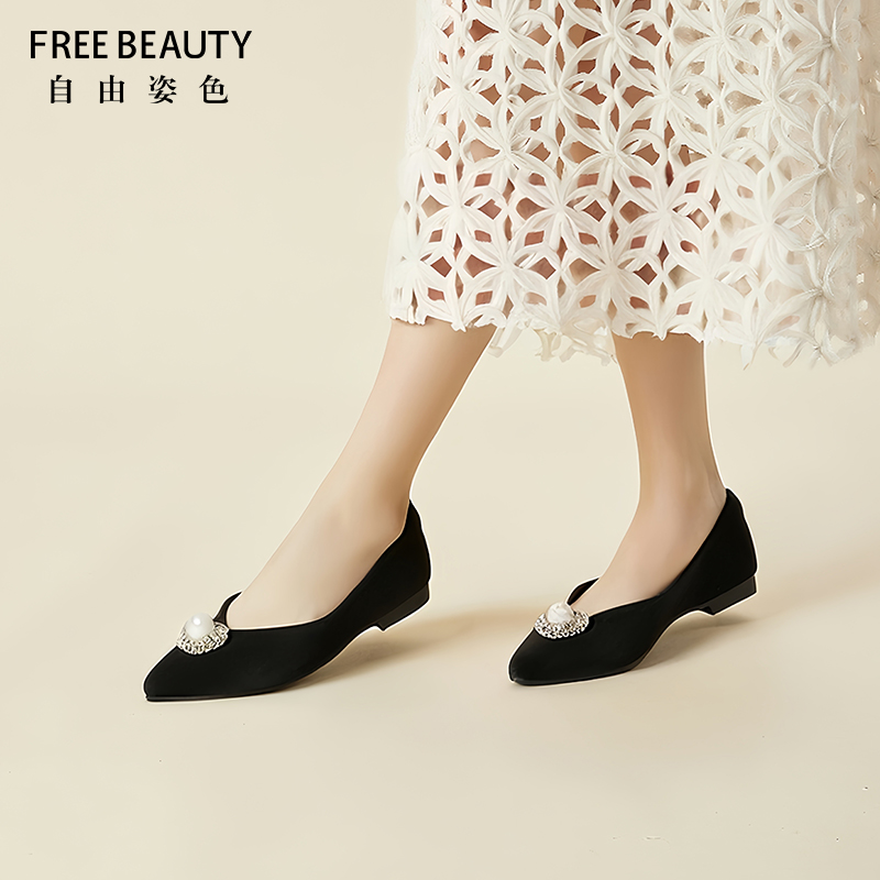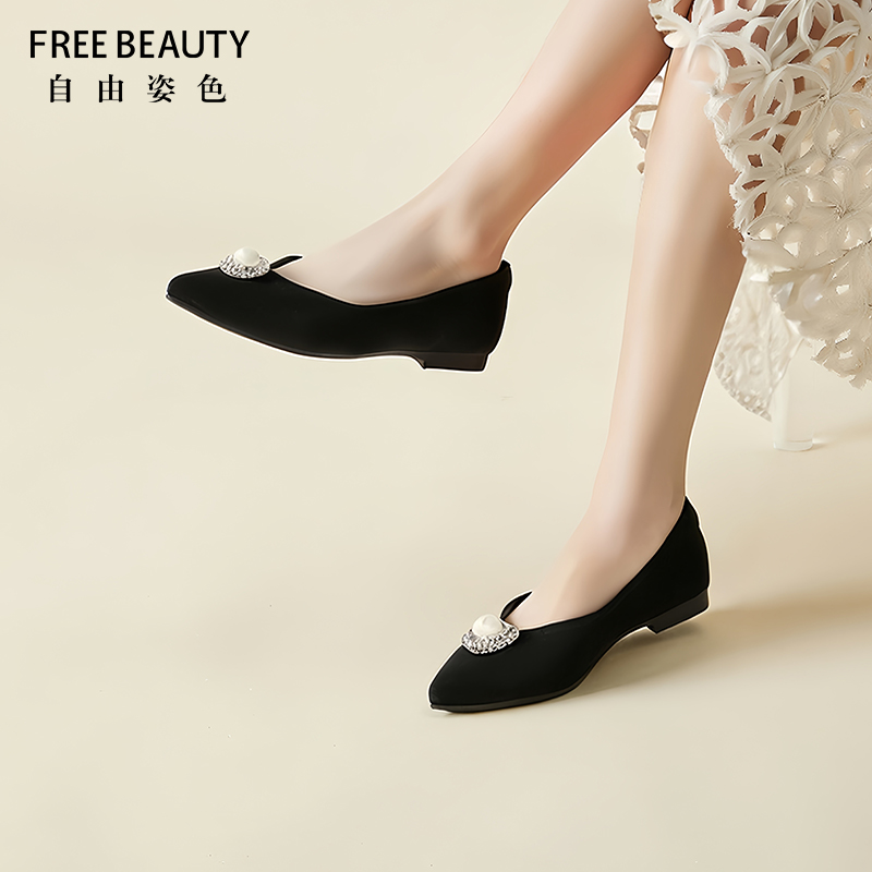 商场同款 25年春秋新自由姿色天鹅绒奢华质感大珍珠水钻扣浅口单鞋