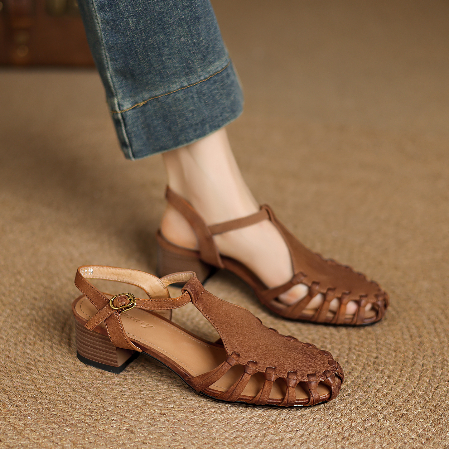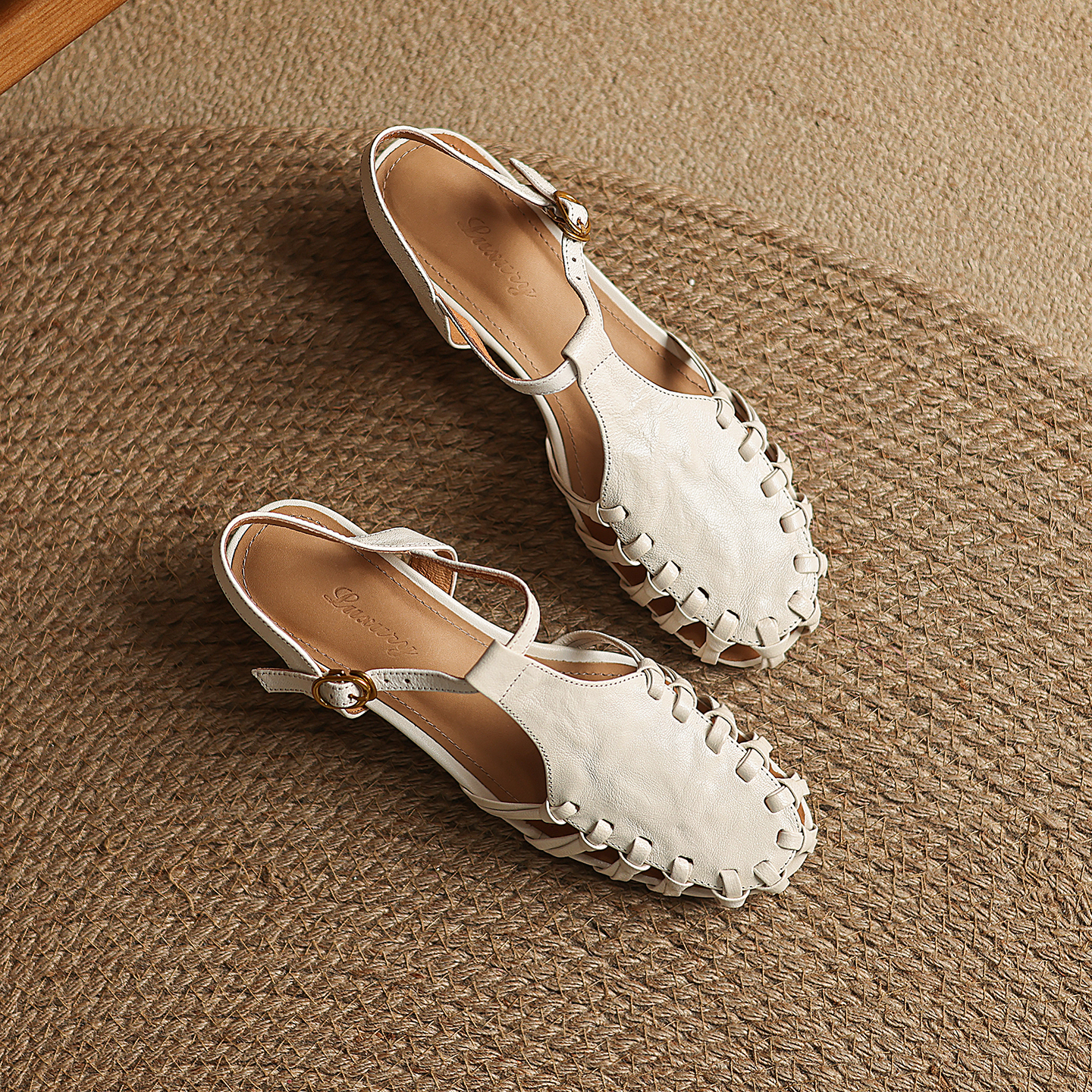 方头平底包头凉鞋 羊皮版 女2025新款 复古编织一字带罗马凉鞋 法式