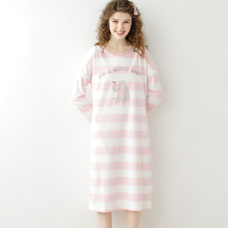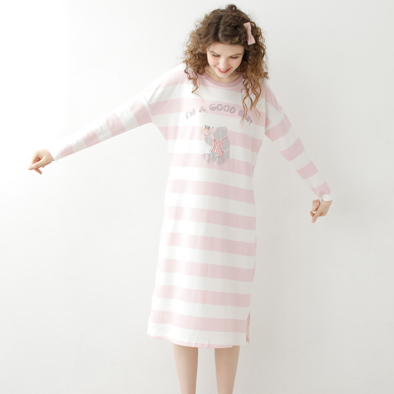 大码 长裙家居服夏款 条纹休闲可外穿 纯棉短袖 悦内睡裙女士睡衣夏季