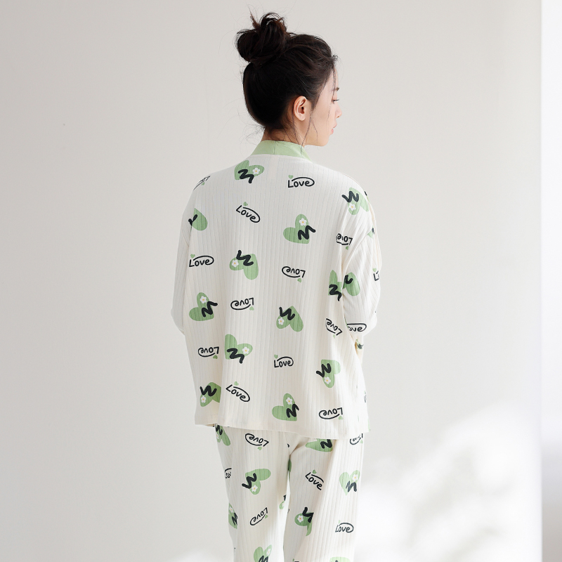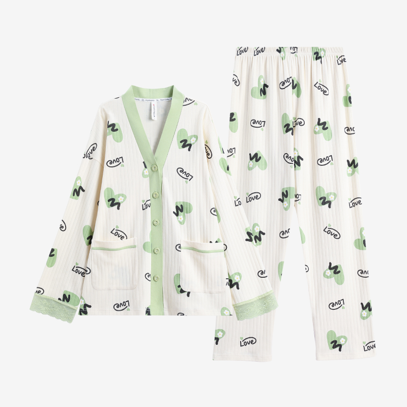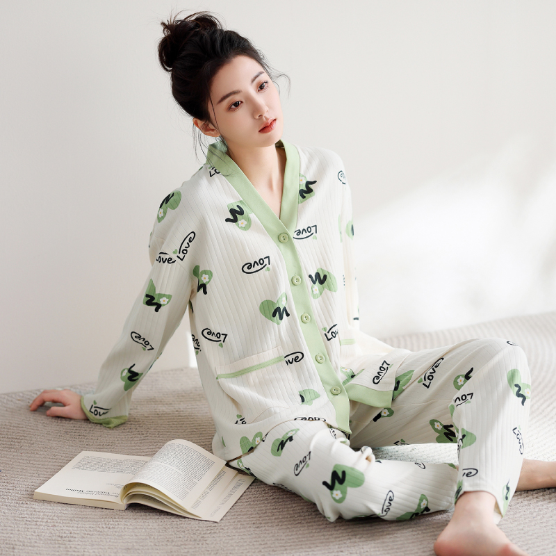 口宽松V领可外穿秋季 芬腾睡衣女春秋款 蕾丝袖 长裤 家居服 纯棉长袖