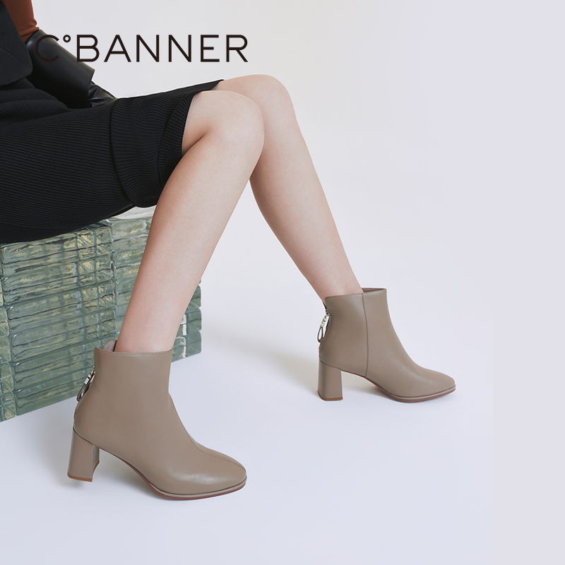 靴超软小羊皮瘦瘦靴粗跟圆头舒适短靴真皮 时装 千百度女鞋 冬季