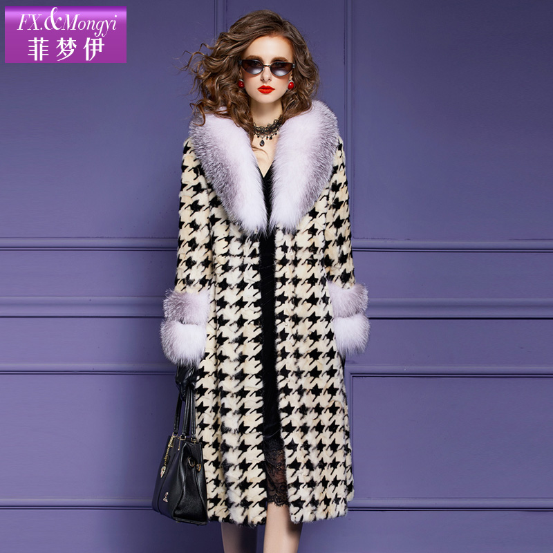 菲梦伊水貂毛皮草外套女冬季 狐狸毛领加厚保暖高级千鸟格大衣 新款