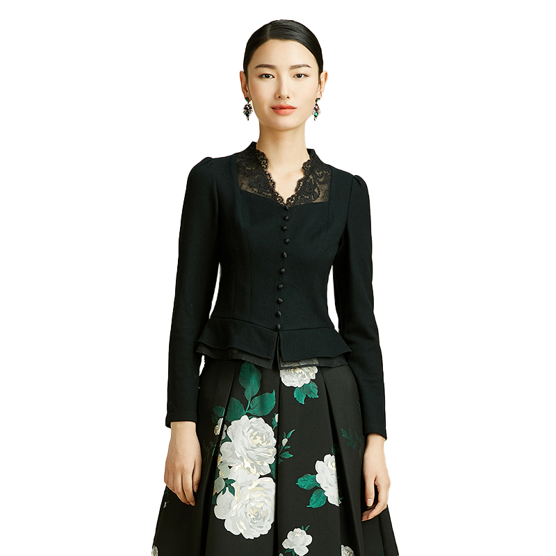 商场同款 新品 黑色花边蕾丝V领排扣荷叶边上衣女 古色冬季 SUSSI