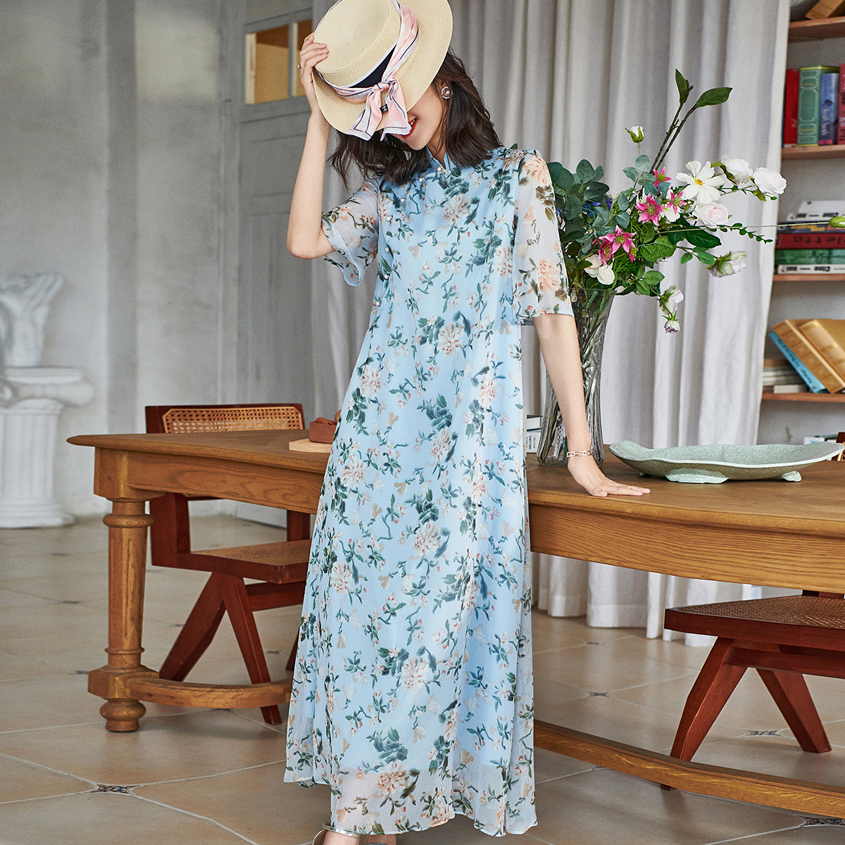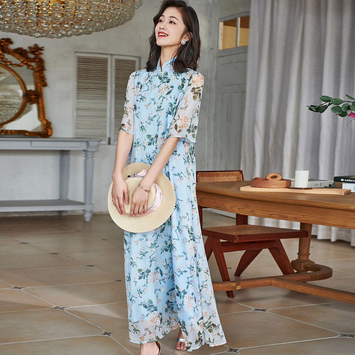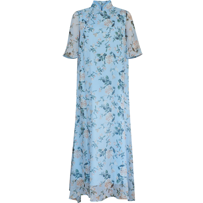 蓝色雪纺旗袍透气宽松显瘦妈妈温柔连衣裙长裙 碎蓝改良版 夏季 新款