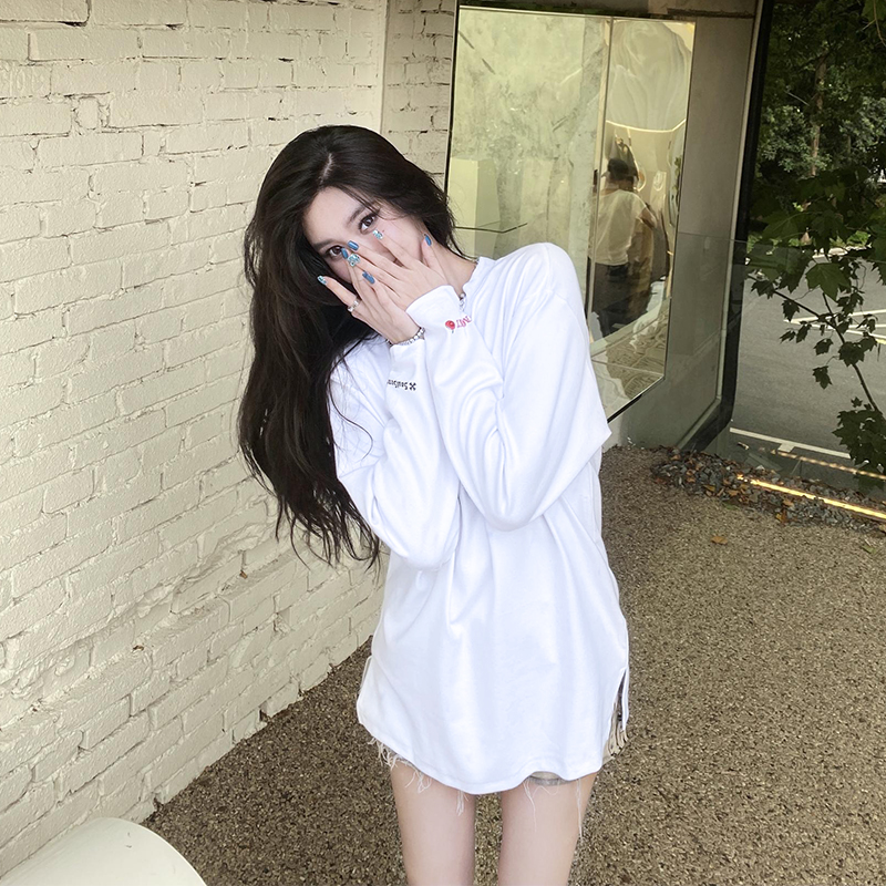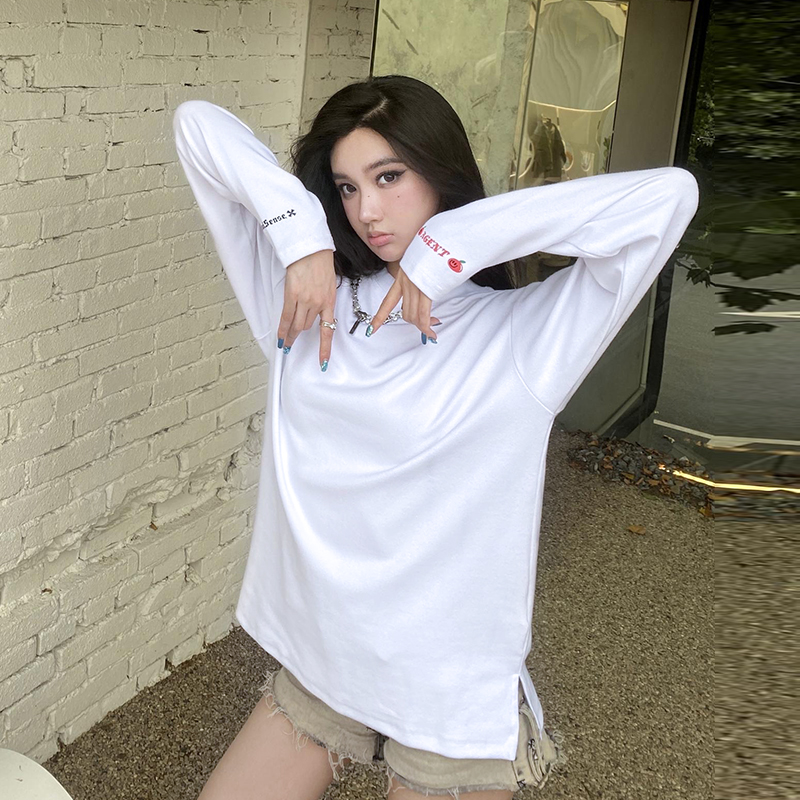 100%纯棉长袖 宽松遮肉显瘦套头外穿拼接薄卫衣E T恤上衣女秋冬韩版