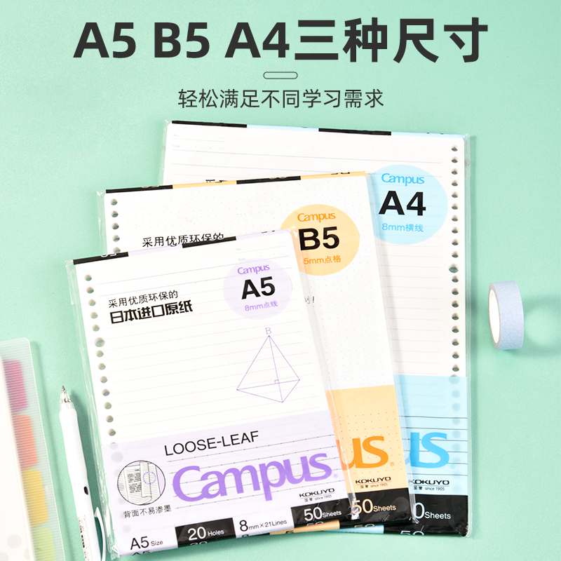 KOKUYO国誉活页替芯26孔B5活页纸campus横线空白笔记本本子可替换芯纸活页本内页纸20孔A5方格纸 保障 正品