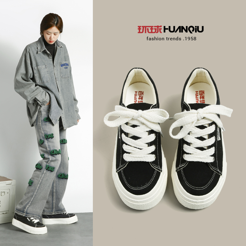 百搭学生休闲运动小众厚底板鞋 新款 子女2025年秋季 环球黑色帆布鞋