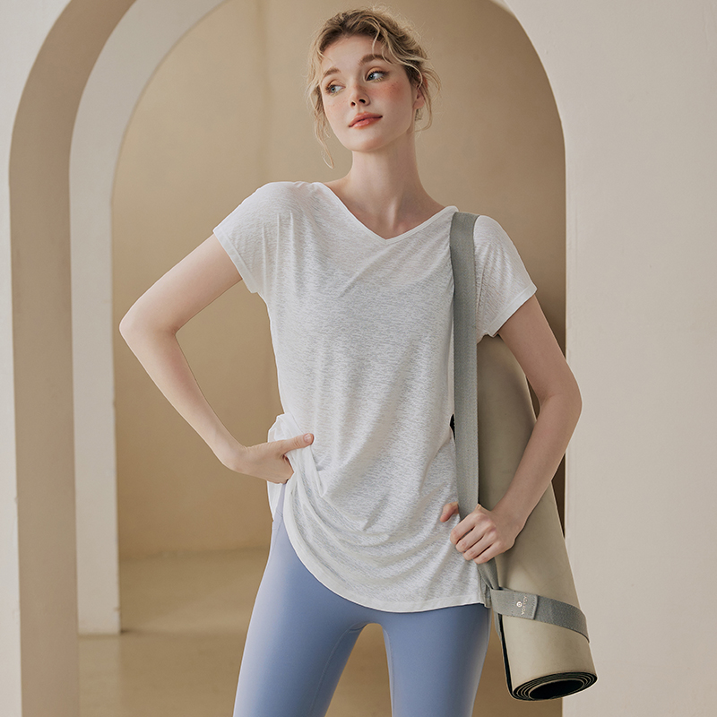 夏季 宽松显瘦运动短袖 薄款 遮臀瑜伽服罩衫 女镂空美背健身T恤长款