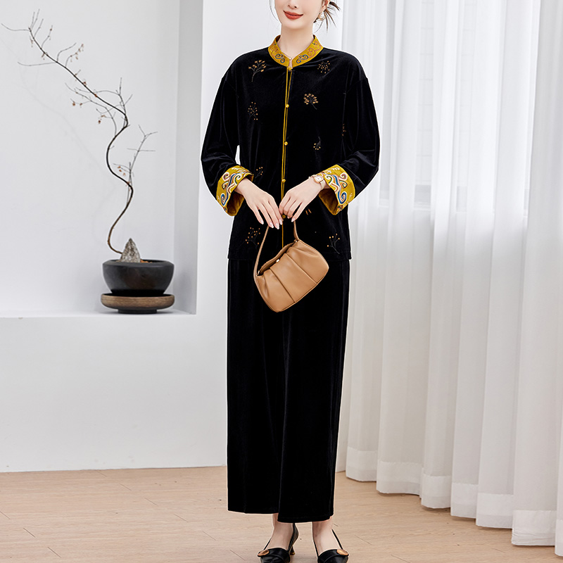 刺绣套装 中式 中年阔太太金丝绒两件套40 外套2025新款 妈妈国风秋装